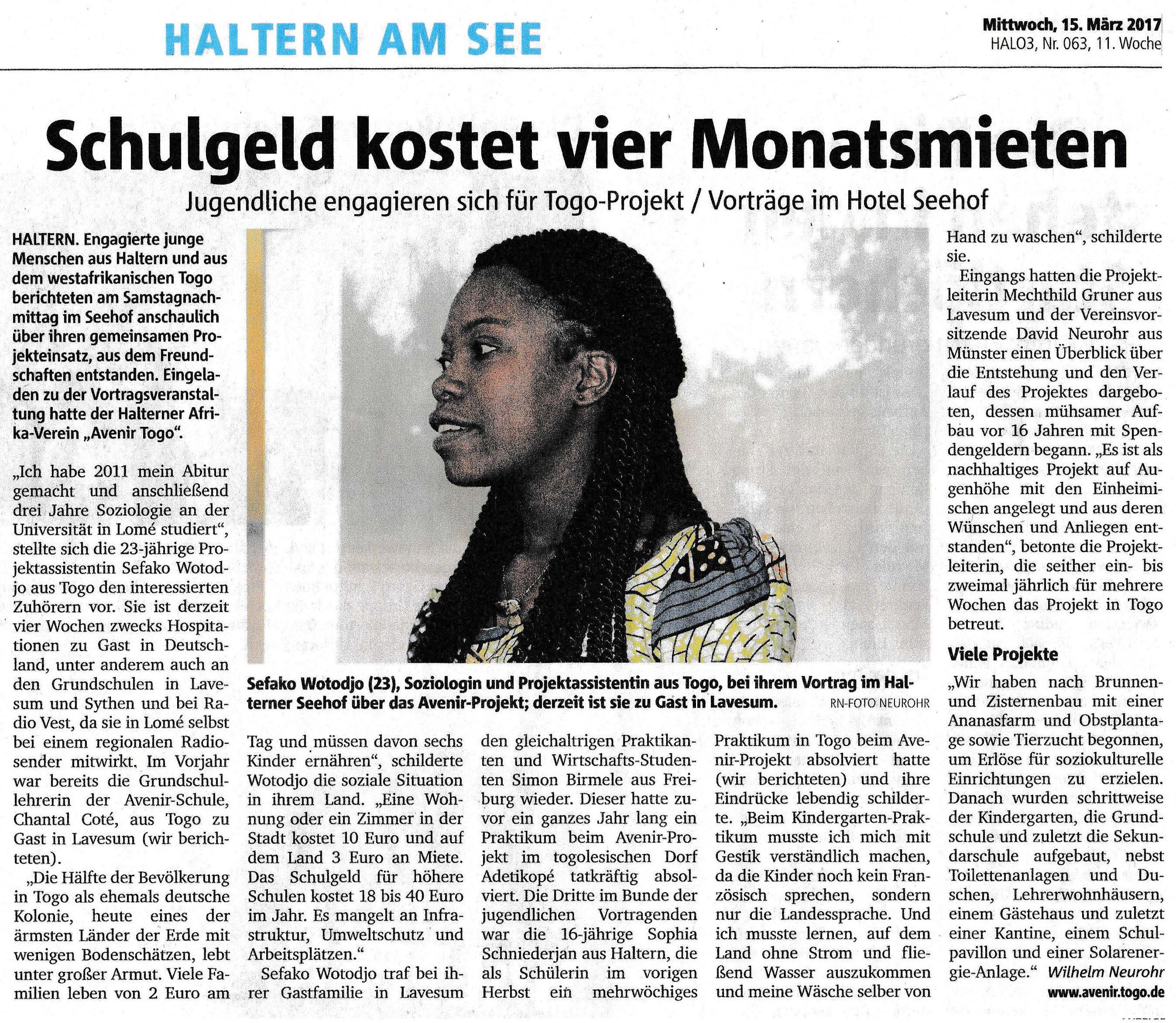 Der Verein Avenir bedankt sich ganz herzlich bei den zahlreichen Zuhörern und interessierten Menschen, die sich am 11. März 2017 im Seehof in Haltern zu unserer Veranstaltung "Afrika helfen - aber wie? Avenir - Möglichkeiten und Grenzen eines nachhaltigen Entwicklungsprojektes in Togo" eingefunden haben.