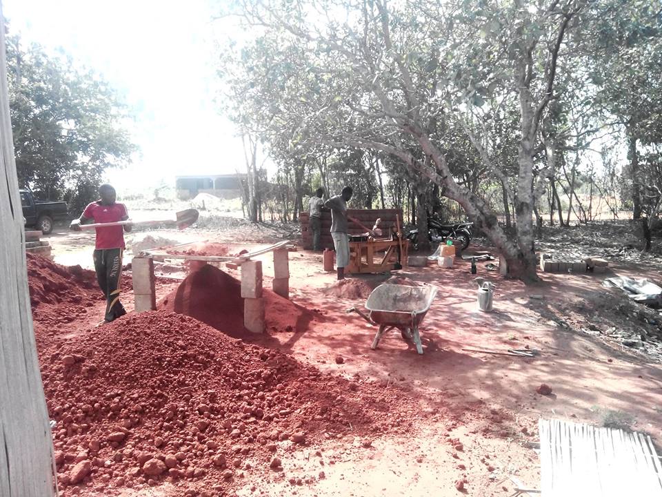 Die Bauarbeiten für die Errichtung des geplanten Freiluftklassenraums haben begonnen und das Fundament ist bereits fertiggestellt. Derzeit werden tausende Ziegel aus roter Erde direkt vom Avenir-Grundstück hergestellt, die anschließend ca. 2 bis 3 Wochen zur Trocknung in der Sonne liegen werden, bevor das Mauerwerk errichtet wird.